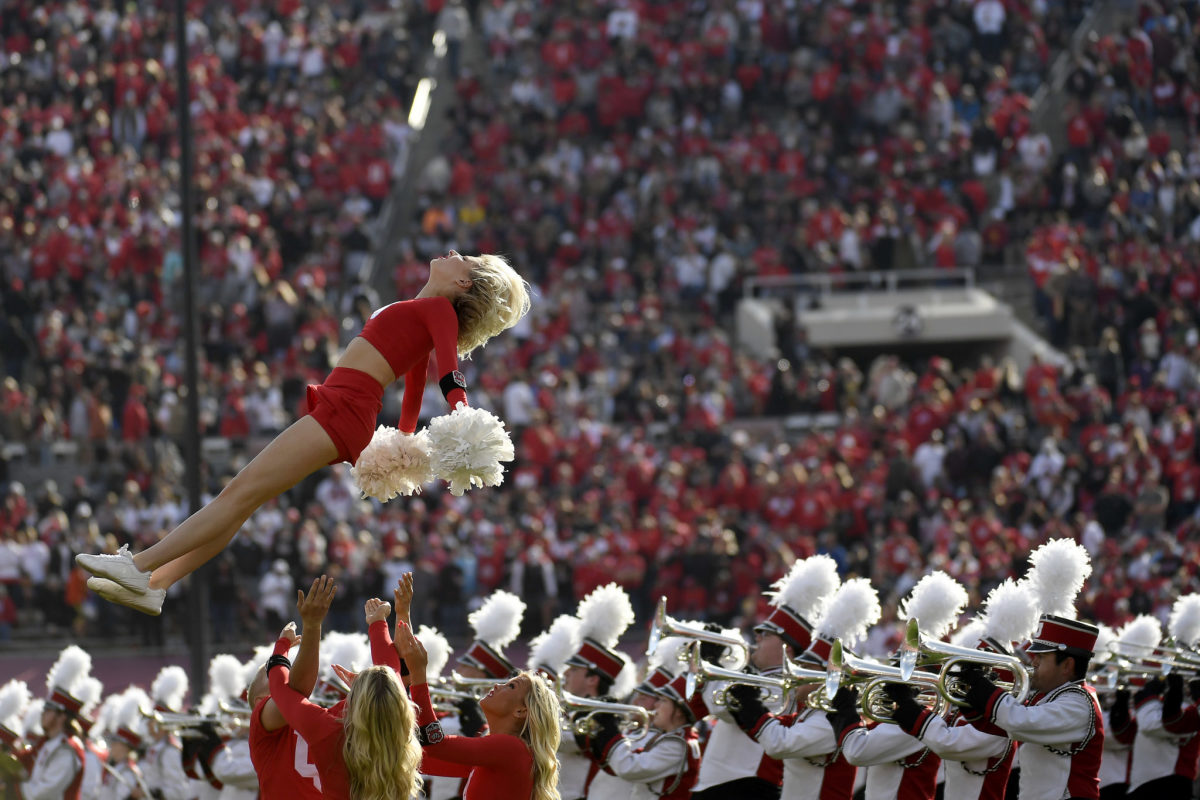 PASADENA, CALIFORNIA – JANUARY 01: Utah Utes cheerleaders carry out previous to the sport towards the Ohio State Buckeyes within the Rose Bowl Sport at Rose Bowl Stadium on January 01, 2022 in Pasadena, California. (Picture by Kevork Djansezian/Getty Pictures)